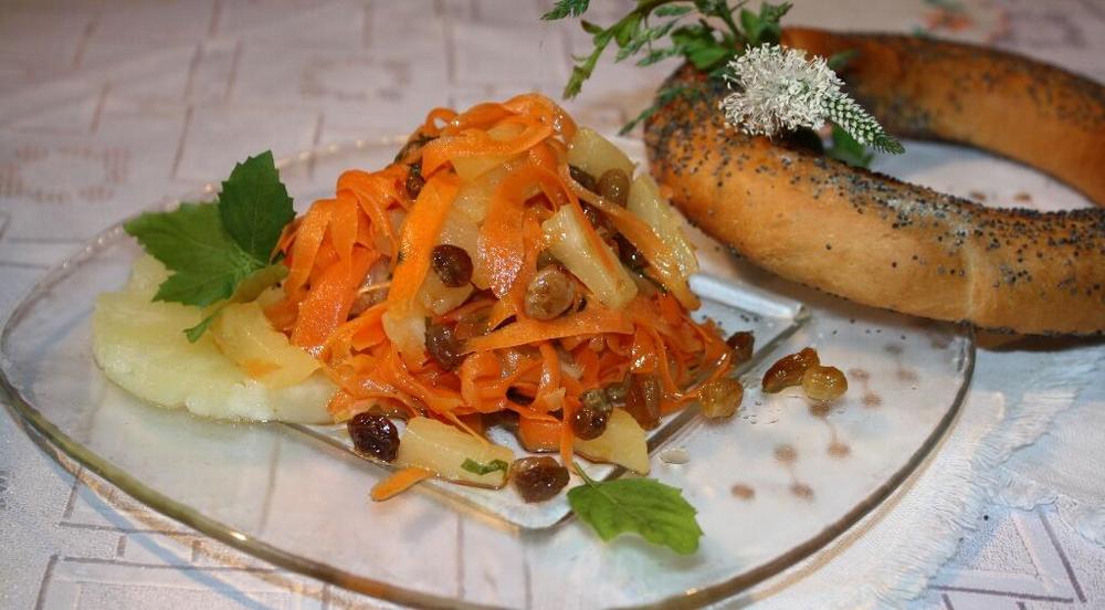 200 гр моркови, 100 гр ананаса из компота, 1-2 столовые ложки изюма, по 1 столовой ложке растительного масла и красного полусладкого вина, 1 чайная ложка красного винного уксуса, 2 столовые ложки компотного сиропа, по щепотке молотого перца чили и имбиря, 1 столовая ложка рубленых листьев базилика, соль и сахар по вкусу.