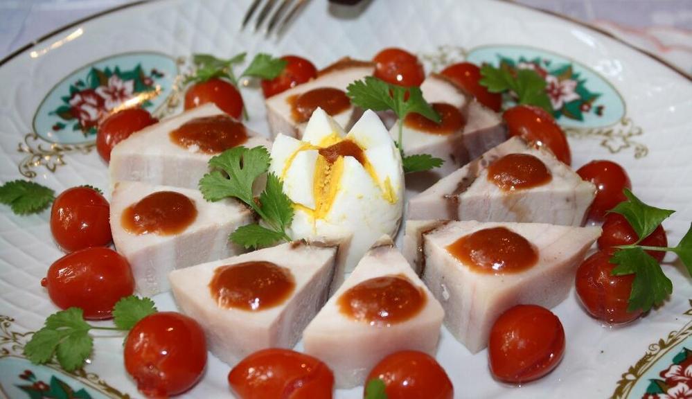Рулет нарезать толстыми кольцами, удалить кожу, нарезать радиально, выложить на тарелку. Мясо полить соусом, гарнировать помидорами. Оставшийся соус подать отдельно.