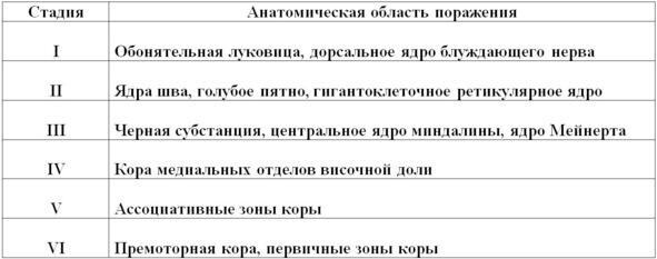 Таб. 6. Патоморфологические стадии развития болезни Паркинсона (по Braak et al., 2003).
