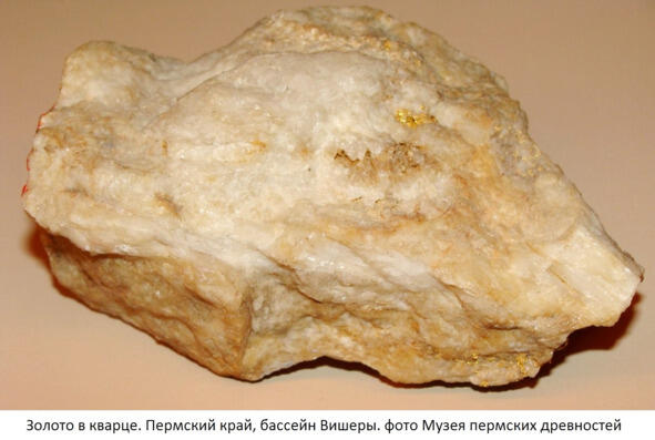 Первое настоящее золото я увидел в августе 1978 года в витрине Пермского краеведческого музея. Там было много разных красивых камней, подобных тем, что были изображены в «Занимательной минералогии» А. Е. Ферсмана. Камень с золотом среди них красотой не выделялся. Да и крохотные жёлтые вкрапления разглядеть в нём удалось не сразу. Табличка под камнем гласила: «Золото в кварце». «Почти как пирит, только цвет ярче», подумал я.