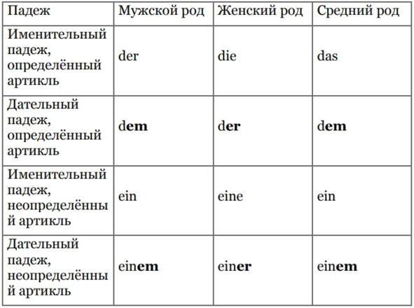 Поскольку немецкий язык является аналитическим, многие функции (определённость-неопределённость, род, падеж, число и др.) берёт на себя служебное слово артикль. Всего имеется четыре определённых и три неопределённых артикля: