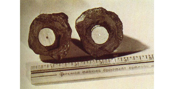 Интересная находка была сделана в 1961 году в Калифорнии (США). Трое друзей Майк Мейкселл, Уоллес Лейн и Вирджиния Мекси часто совершали походы в район горы Косо, чтобы поискать красивые поделочные камни, которые они потом продавали в своей лавочке сувениров. Особый интерес у друзей вызывали жеоды минеральные образования шаровидной формы, во внутренних пустотах которых попадались редкие по красоте сростки кристаллов горного хрусталя или аметиста. Обычно профессиональные охотники за минералами не разбивают жеоды на месте находки, а вскрывают их с помощью алмазной пилы. Однажды Майк около озера Оуенс рядом с горой Косо нашел жеоду, покрытую корой из окаменевших черепашек, и друзья прихватили ее с собой, чтобы распилить дома. Когда Мейкселл начал распиливать свою находку, стало ясно, что внутри было какое-то странное вещество, чем-то похожее на керамику. В центре этой керамической массы был виден срез металлического прутка диаметром 2 мм из белого металла. «В разрезе жеода имела следующий вид: под шаром черепашек находилась небольшая призма с правильным шестиугольным основанием диаметром 32 мм из мягкого и хрупкого материала, в ней медная спираль, которая, скорее всего, проходила по всей длине призмы и была частично разъедена, спираль, в свою очередь, охватывал чрезвычайно твердый керамический стержень диаметром 18 мм, через который проходил металлический пруток диаметром 2 мм», такое описание этой находки дают в книге «Загадки древности» Г.Е.Бурганский и Р.С.Фурдуй.
