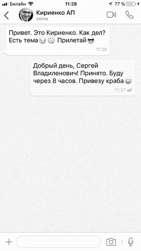 «Привет. Как дел? Это Кириенко. Есть тема. Прилетай».