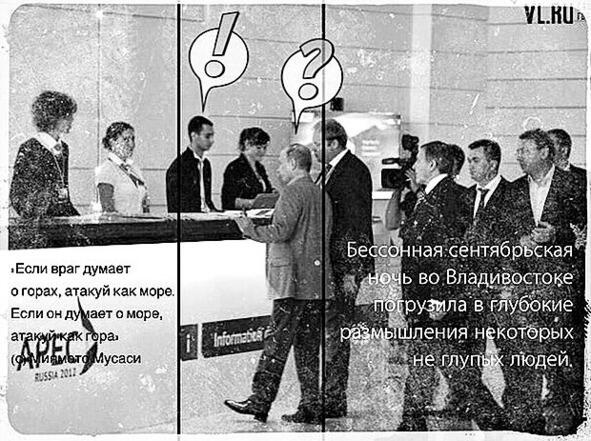 Тёплая сентябрьская ночь будоражила Владивосток энергией форума ВЭФ. Сильные мира сего прибыли в наш чудный город, чтобы пофотаться на фоне красивого кампуса и наконец-то попасть в фотоотчёты на сайты ДВФУ и администрации Владивостока. И в сегодняшнюю ночь сладкий сон покинул некоторых исторических персон, ведь сама жизнь ставила перед ними вопросы.