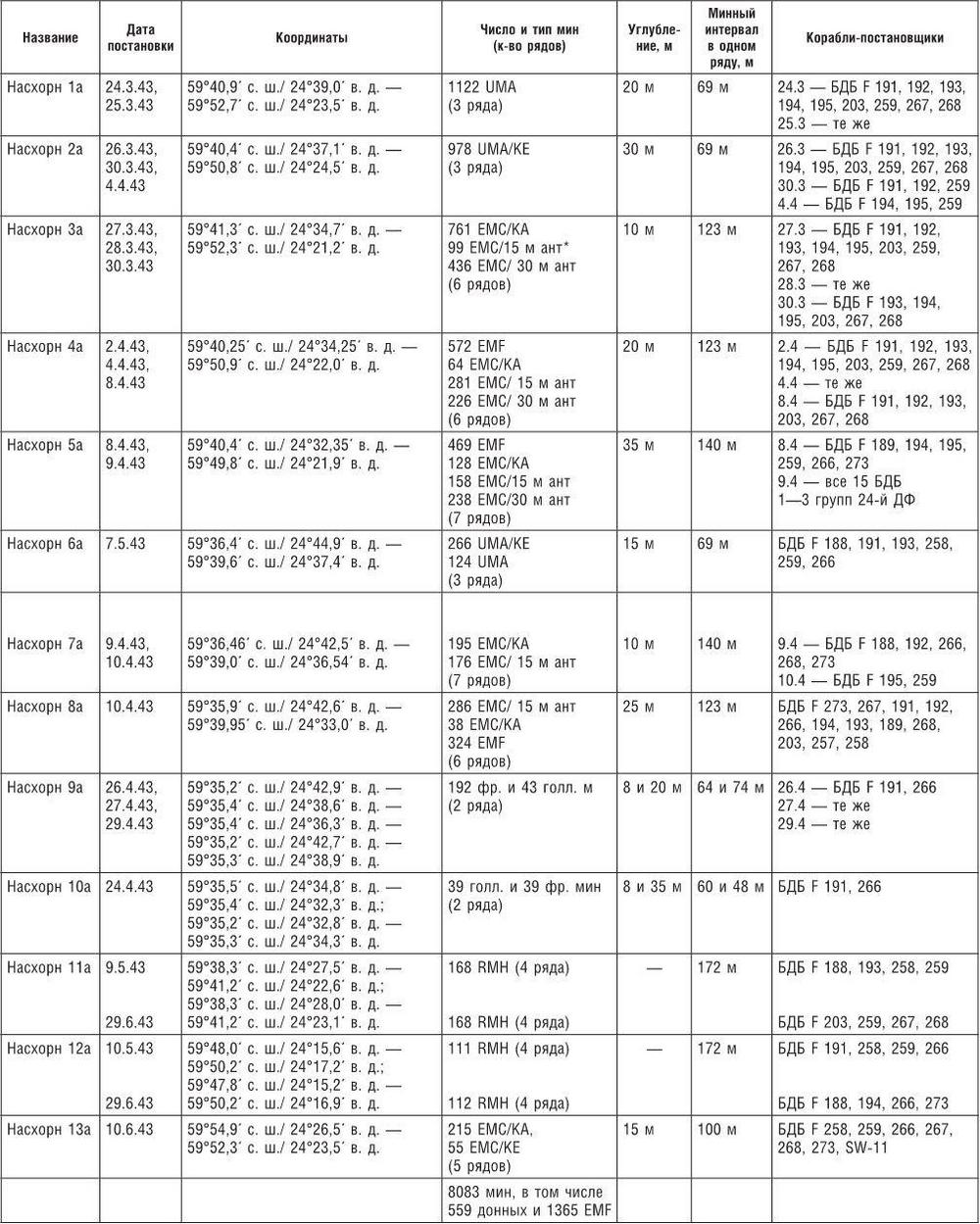 Помимо этого были выставлены четыре схожих по плотности заграждения на входе в Таллинскую бухту. В мае и июне за этим последовала постановка еще четырех заграждений (1219 мин)[26] одного на входе в Таллинскую бухту, одного перекрывавшего мелководье между маяком Порккалан-Калбода и полуостровом Порккала-Удд и двух из донных неконтактных мин близ сетевого заграждения «Вальросс» в тех местах, где сети не достигали дна. К 29 июня моменту завершения противником постановок на рубеже Порккалан-Калбода о. Найссаар на нем с учетом мин, сохранившихся с 1942 г., стояло не менее 9,5 тыс. смертельных сюрпризов. Плотность заграждения была беспрецедентной до момента достижения сети, следуя по использовавшемуся в 1942 г. фарватеру, каждой подлодке предстояло бы пересечь 31 минную линию, что практически не оставляло шансов на возвращение.