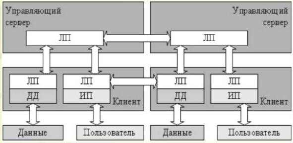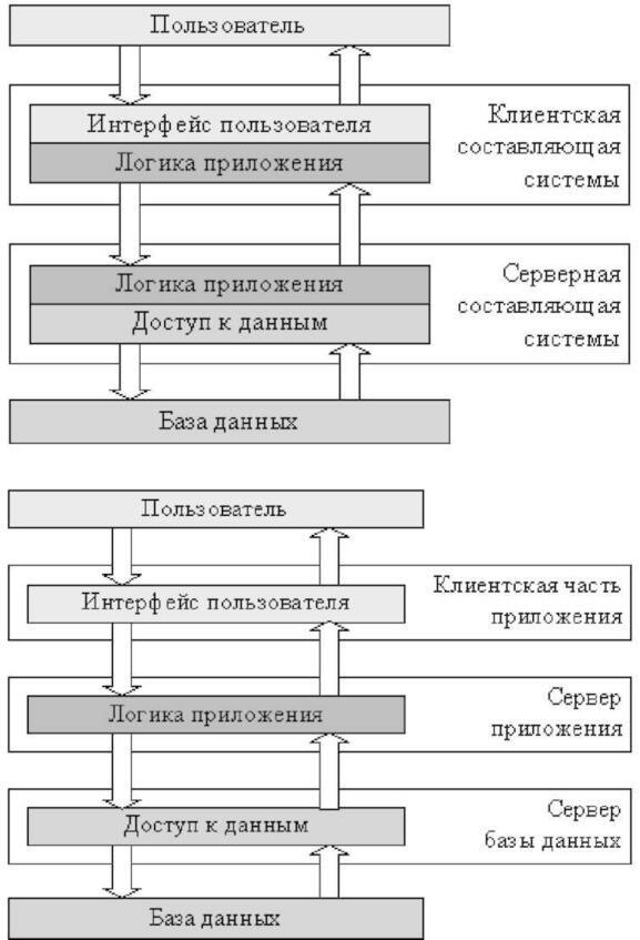 Поскольку на практике разных пользователей системы обычно интересует доступ к одним и тем же данным, наиболее простым разнесением функций такой системы между несколькими компьютерами будет разделение логических уровней приложения между одной серверной частью приложения, отвечающим за доступ к данным, и находящимися на нескольких компьютерах клиентскими частями, реализующими интерфейс пользователя. Логика приложения может быть отнесена к серверу, клиентам, или разделена между ними. Архитектуру построенных по такому принципу приложений называют клиент-серверной или двухзвенной. На практике подобные системы часто не относят к классу распределенных, но формально они могут считаться простейшими представителями распределенных систем.