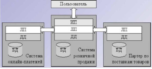 Применительно к приложениям автоматизации деятельности предприятия, распределенными обычно называют системы с логикой приложения, распределенной между несколькими компонентами системы, каждая из которых может выполняться на отдельном компьютере. Например, реализация логики приложения системы розничных продаж (рисунок 1.2) должна использовать запросы к логике приложения третьих фирм, таких как поставщики товаров, системы электронных платежей или банки, предоставляющие потребительские кредиты. Таким образом, в обиходе под распределенной системой часто подразумевают рост многозвенной архитектуры «в ширину», когда запросы пользователя не проходят последовательно от интерфейса пользователя до единственного сервера баз данных.