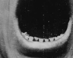 Разберем также насыщенный спецэффектами фильм Джеймса Уильямсона «Большой глоток» (1901 г.). Сам Уильямсон так описал свой фильм в каталоге: «Я не хочу, я не хочу, я лучше съем аппарат!» Читающий джентльмен, которого мы наблюдаем с точки зрения оператора, замечает нас и выразительно протестует против съемок. От подходит все ближе к нам, перемещаясь из общего плана в сверхкрупный в кадре остается видна только его голова и наконец только его открытый рот, в который мы проваливаемся вместе с камерой. Чтобы удержать актера Сэма Далтона в фокусе, Уильямсон несколько раз останавливал съемку и, пока Далтон неподвижно стоял, менял настройку. План открытого рта актера Уильямсон смонтировал с черным фоном, на который наложил кадры с падающей камерой и «оператором», затем следовал план активно жующего актера, удаляющегося от камеры (Рисунок 17).