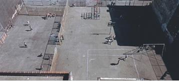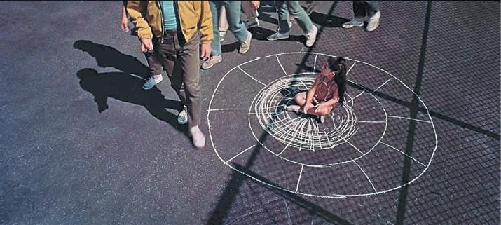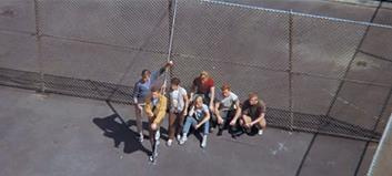Первые пять минут, пока играет знаменитая увертюра Леонарда Бернстайна, на экране статичное изображение, составленное из вертикальных отрезков. Увертюра заканчивается, абстрактная картина наплывом превращается в величественную панораму нью-йоркского Манхэттена. Минуту мы летим над высотными зданиями, но на седьмой минуте фильма под нами уже бедные районы. Мы быстро снижаемся вот крыши дешевых многоквартирных домов, вот спортплощадка, а вот и молодежная банда, которая здесь базируется (Рисунок 1). Всего за полторы минуты целый мир, который олицетворяет многомиллионный Манхэттен с его небоскребами, масштабировался до одной подворотни.
