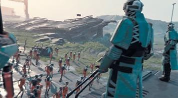 Мы хотели, чтобы персонажи были одеты в нечто оранжевое, напоминающее тюремные робы. Но механические тела не нуждаются в одежде! Вариант с краской мы отвергли, поскольку он уводил восприятие в сторону роботов. Мы решили заменить одежду упаковочным материалом чем-то вроде пленки, которой обтягивают товары после их изготовления на заводе