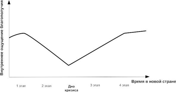 Это общее представление об изменении ощущения внутреннего благополучия, уровня удовлетворённости жизнью в зависимости от этапа адаптации к жизни в новой стране. Нужно понимать, что у кого-то эта кривая бывает с сильным прогибом, а у кого-то чуть-чуть изогнута. От чего это зависит? Как сделать её более ровной? Читайте Главу 4 «Что влияет на успешность переезда». Там найдёте ответы на все эти вопросы!