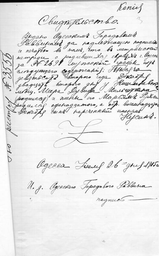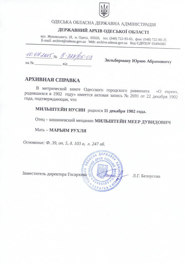 Естественно, возникла необходимость еще раз пересмотреть «Книги рожденных евреев Одессы», хранящиеся в архиве. На этот раз поиск увенчался успехом: запись 2692 в «Книге рожденных евреев Одессы за 1902 год», которая подтвердила, что «11 декабря 1902 года у Кишиневского мещанина Меера Мильштейна и его жены Марьям Рухля родился сын Нусин» (см. илл. 16, 16-а). Как мы помним по мемуарам скрипача, он пишет, что родился в последний день года. Странным образом, Натан Миронович трактовал цифру своего не рождения, а обрезания, которое действительно состоялась 18 декабря, что по-новому исчислению равнялось 31 декабря. Да и год-то не 1903, а 1902! Понятно, что стать на год-два моложе приятно, особенно человеку после 4050 лет. Н. Мильштейн, в отличие от свого друга В. Горовица18, не скрывал, что они вынуждены были изменить свой год рождения на 1904 г. Более того, в своих мемуарах он об этом пишет! Однако умалчивает о том, что в 1925 г. ему исполнялось уже 23 (!) года. Причину этой странной «забывчивости» мы вряд ли узнаем, но то, что Натан Мильштейн перед отъездом за границу в Одессе не был это факт, который он сам подтверждает в своей книге. Тогда возникает вопрос: как он получил заграничный паспорт19 со столь значительным «пониженим» возраста?
