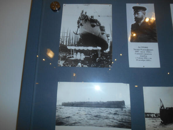 В витрине с закладными досками кораблей, построенных на этом заводе, лежат закладные доски крейсера «Очаков», построенного в Севастополе, и яхты «Штандарт», построенной в Дании.