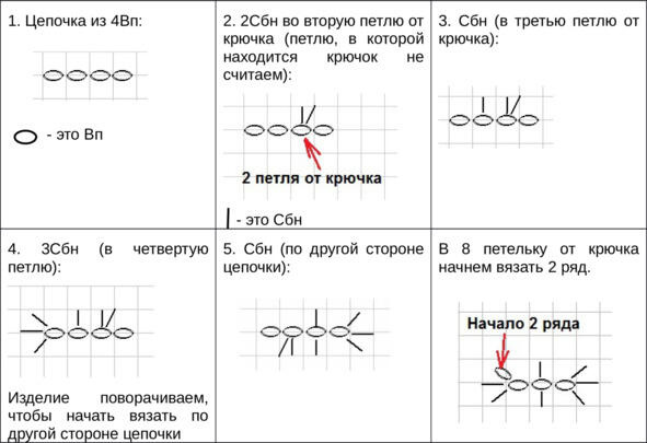 1 ряд. 2Сбн (во вторую петлю от крючка), Сбн, 3Сбн. Далее вязать по другой стороне цепочки Сбн = 8 п.