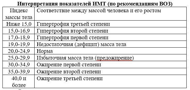 Ещё один показатель, который часто используется диетолагами индекс массы тела (ИМТ), один из самых известных и всеобще признанных индексов. Он легко высчитывается и зависит от веса и роста, его значение определяет риск развития сердечно-сосудистых патологий. Чтобы высчитать ИМТ, необходимо разделить вес в килограммах на квадрат роста в метрах. ИМТ = вес (кг) / рост² (м), но и здесь достоверность этого показателя страдает, когда дело касается «качков», так как их ИМТ всегда будет указывать на ожирение различных стадий. Опять же в моём случае, тот вес к которому я так стремился, в соответствии с этим расчётом говорит мне о том, что я в предожирении1