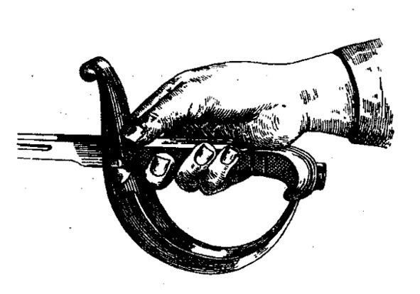 Сабля берется в правую руку так, чтобы ее конец упирался в мякоть руки над мизинцем, большой палец вытянут вдоль спинки, указательный согнут и касается внутренней стороны гарды. Мизинец плотно сжимает рукоять, остальные пальцы лишь обхватывают ее (рис. 1).