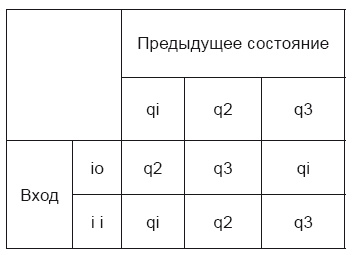 Этот пример типичен для машин с дискретными состояниями. Такие машины можно описывать с помощью таблиц, при условии что они обладают конечным числом возможных состояний.