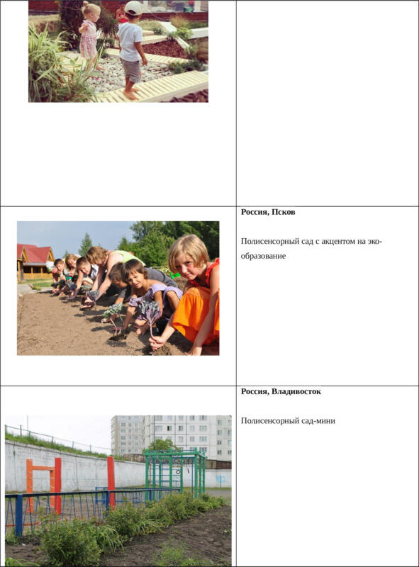 В России актуальность «Сенсорного сада» («Сада ощущений») только набирает обороты. Запущена государственная программа «Доступная среда» на 20112015 гг. Благодаря активистам и волонтёрам разрабатываются и воплощаются в жизнь проекты сенсорной среды: «Сенсорный сад» для детей с физическими недостатками в Москве, Екатеринбурге, Владивостоке, в Псковской области16.