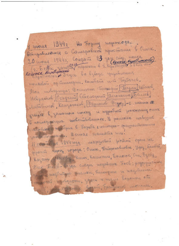 20 июля 1944 года становимся солдатами 23 запасного стрелкового полка в г. Бердск. Затем полк перевели под г. Куйбышев, в 6 км. от г. Барабинска. Учусь во взводе управления полковой артиллерии. Наш комбат лейтенант Горбачёв. Мои товарищи: Долинин Геннадий, Таран, Кабанов, Невратов, Осадчий, Стелецкий, Лёгоньких, Беляев, Литвинов, Канзачаков, Фарносов Фёдор с ними учился в запасном полку и подробней расскажу о них в последующих повествованиях. Многие из них пали смертью храбрых в борьбе с немецко-фашисткими захватчиками. Вечная память им!