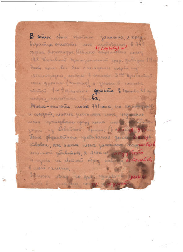 В этих своих коротких записках, я хочу вкратце описать мою службу в 741, ордена Александра Невского стрелковом полку, 128-й Псковской, Краснознамённой стрелковой дивизии, 118 корпуса. Этот полк вёл бои с немцами вначале под Ленинградом, потом в составе 3-его Прибалтийского фронта (Эстония), затем в составе 1-го Украинского фронта, в составе 21-й Армии, под командованием генерал-полковника Гусева.