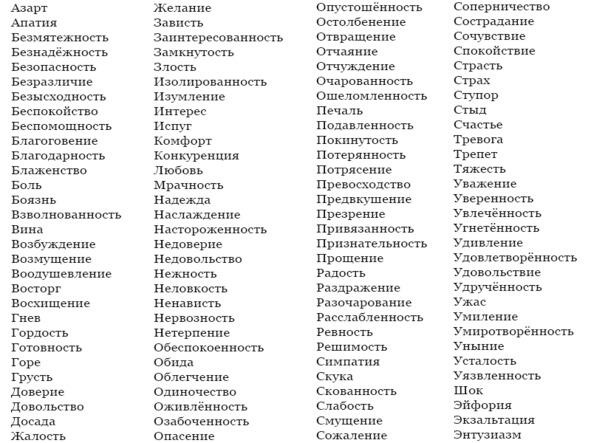 Список чувств, эмоций, состояний, в алфавитном порядке: