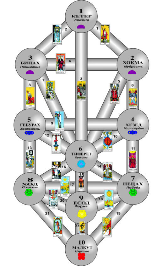 Чего стоит только привязка Дерева к нашей Чакральной системе. Даже беглого взгляда на рисунки чакр, спроектированных на Сефирот достаточно, чтобы понять, кто может дотянуться на тот или иной уровень. И если вы сейчас остановите взгляд на этом рисунке, то легко сможете понять, какие Арканы вам «по-зубам». Настройтесь на свой живот и попробуйте почувствовать там желтую чакру. Если человек умеет как-то зарабатывать деньги, значит он уже наработал необходимые драйвера для этой чакры. Стало быть, может не только ассоциировать себя «с этим местом» в теле, но и представлять себя в данной области на Дереве Сефирот.