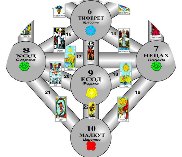 А теперь соединяем нашу Чакральную систему и рисунок Дерева Сефирот, на котором показаны чакры. Это дает нам понимание того, какие Арканы доступны нам на этом уровне «по умолчанию». То есть хотим мы того или нет, но имея вот такой статус, рисунок чакр, а значит положение Точки Сборки, мы естественным образом проводим целый спектр Арканов. И в этом списке обязательно будет присутствовать три основных религия, жизнь и связи.