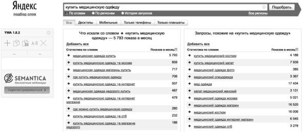 Например, запрос «купить медицинскую одежду» имеет 5 тысяч показов в месяц, «магазин медицинской одежды» 16 тысяч, «каталог медицинской одежды» 6 тысяч, что в сумме дает 27 тысяч показов в месяц и говорит об отличном спросе в розничном и оптовом сегментах. А если учесть, что медицинские работники ищут одежду по таким запросам, как «медицинский халат», «медицинский костюм», «медодежда», «одежда для докторов», то сумма частотности превышает 100 тысяч показов в месяц, и это является прекрасным показателем для потенциальной ниши.