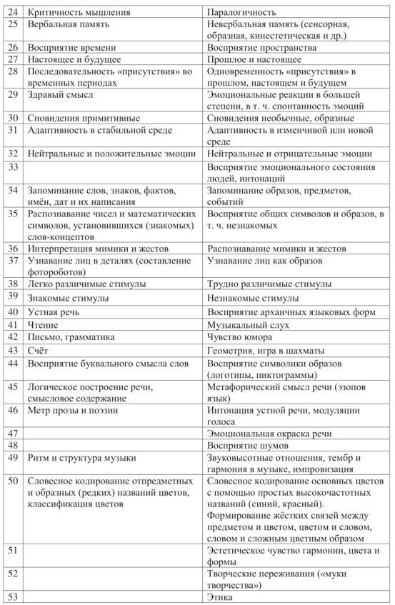 При решении же силлогизмов левое полушарие склонно использовать адекватный логико-теоретический подход, а правое эмпирический (с привлечением собственного жизненного опыта), причём эффективность левого полушария в данном типе задач чрезвычайно высока, особенно в случае повышенных требований к точности, например, при распознавании бессмысленных словосочетаний, абстрактных слов (с малой степенью образности). Правое полушарие специализируется на опознании пространственных характеристик зрительных и звуковых стимулов, а также слов, имеющих высокий уровень конкретности.