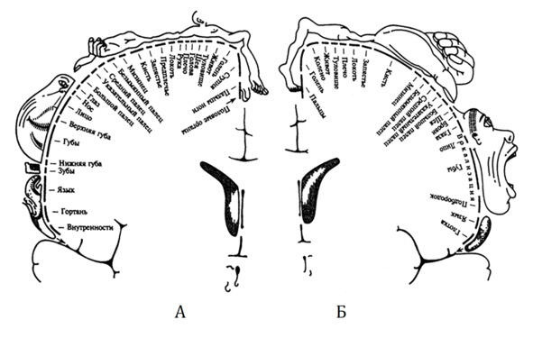 Рис. 1. Схема У. Г. Пенфилда. Площадь проекции отдельных поверхностей тела в проекционных зонах мозговой коры: А корковая проекция к расхождению чувствительности, Б корковая проекция двигательной системы