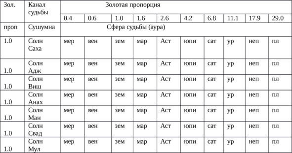 Аура это сфера судьбы, в которой записаны изменения судьбы. Источник изменений судьбы это Солнце и планеты солнечной системы (мер Меркурий, вен Венера, зем Земля, мар Марс, Аст пояс Астероидов, юпи Юпитер, сат Сатурн, ур Уран, неп Нептун, пл Плутон), точнее, образы планет в ауре. Ощущаются образы планет как энергетические уплотнения, имеющие своё строго определённое местоположение в ауре. Теперь внимание! Данное местоположение в ауре говорит о том, что в определённое время произойдёт событие, которое повлечёт за собой изменение в судьбе человека. Механизм «записи» образов планет в Ауре основан на подобии Солнечной системы Человека как системы Атомарной системы через геометрическую прогрессию золотой пропорции. Чакры Мулахара, Свадхистхана, Манипура, Анахата, Вишудха, Аджна, Сахасрара это своего рода Солнца, которые в зависимости от возраста приобретают окрас чакры, в таблице это выглядит так: Солн. Мул. красный, Солн. Свад. оранжевый, Солн. Ман. желтый, Солн. Анах. зеленый, Солн. Виш. голубой, Солн. Адж. синий, Солн. Саха. белый.