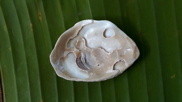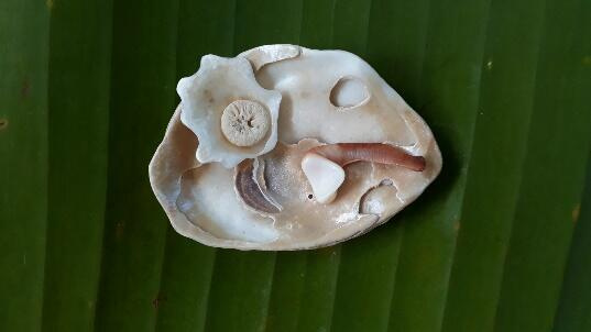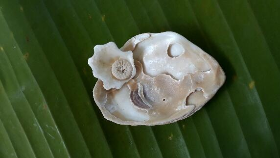 Она словно создана для растительного натюрморта. Требуется добавить совсем немного, например, стилизованный цветочек из маленькой устричной створки с волнистыми краями и сердцевины из небольшого кораллового кругляшка.
