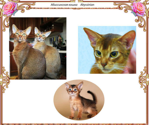 Абиссинская кошка одна из самых древних пород кошек и одна из первых, получивших официальный выставочный стандарт. Она смело идет на руки и постоянно ластится, мгновенно располагая к себе даже самых замкнутых людей. Общение с таким животным доставляет море удовольствия. Она постоянно готова к играм и почти не устает. Игривость представители абиссинской породы сохраняют до глубокой старости. Эти кошки стремятся познавать окружающий мир. Их игривость сохраняется на протяжении всей жизни, но они уравновешенны, интеллигентны и умны, очень ласковы к членам семьи. Абиссинцы не проявляют агрессии, во время игр обычно не выпускают когти, терпеливы к детям. Кошки постоянно патрулируют свою территорию в поисках интересных занятий, любят забираться как можно выше для наблюдения. Представители породы отличаются аккуратностью и чистоплотностью, уважают установленные хозяином правила: не станут драть мебель (особенно при наличии когтеточки), кататься на шторах и сбивать горшки с цветами. Они обладают независимым характером, чувством собственного достоинства, поэтому не станут терпеть неуважительного обращения, не будут постоянно сидеть на руках. Характером они немного напоминают собак: преданны, с удовольствием играют, принося брошенные хозяином предметы. Абиссинская кошка верный друг, который всегда будет рядом. Они не любят одиночества, поэтому рекомендуется иметь ещё какое-нибудь животное в доме, если вы подолгу отсутствуете дома.