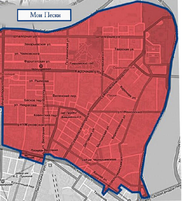 А если быть совсем уже точным, своей территорией я числю превосходящий размерами исторические Пески участок Центрального района, границы которого изгиб Невы, Литейный и Невский. Конечно, границы эти условны, так что во время своего мысленного путешествия по мере надобности и вполне безнаказанно мы будем их нарушать.
