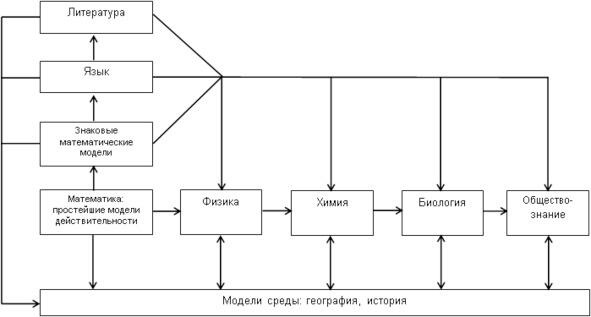 Так уж работает мозг, что знаковые системы формируются на первых стадиях развития его адаптационных реакций. То есть одновременно с формированием образных представлений. Мозг оперирует количественными характеристиками того, что дается ему в опыте, то есть величинами. Следовательно, любые способы отражения действительности при их осознании нуждаются в математическом описании. При этом образное описание, в конечном итоге, тоже сводится к знаковому. Именно поэтому простейшие знаковые математические модели ложатся в основу средства общения людей при помощи знаков и символов, то есть в основу языка. Учащиеся пятых классов общеобразовательной школы, проходящие специальный курс адаптации к предметному содержанию образования в основной школе, самостоятельно приходят к выводу, что «математика это язык, язык это математика». Далее (см. схему) язык, в основе которого лежат знаковые математические модели, обеспечивает формирование всех других моделей, совершенствуясь и усложняясь по мере усложнения этих моделей.