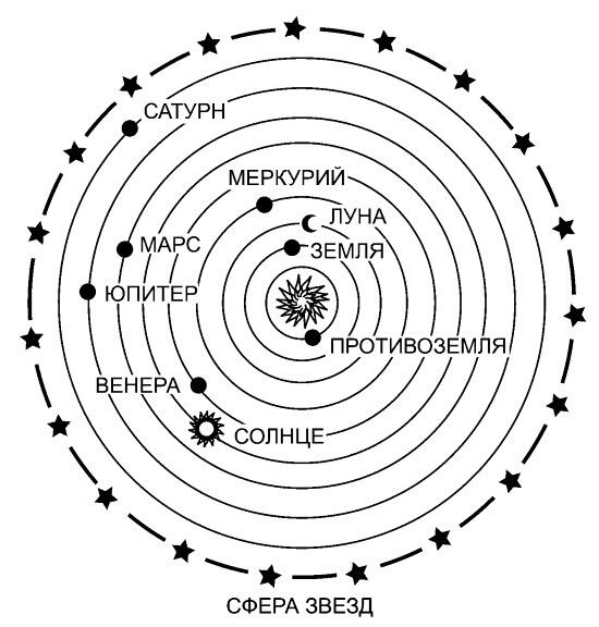 Интересно, что один из учеников Пифагора, Филолай, тогда еще предложил свой вариант строения Мира, отличающийся от гипотезы учителя. Он утверждал, что в центре всех сфер находится не Земля, а некий центральный огонь, который дает свет и тепло всем другим небесным телам. Земля, как и все планеты, вращается со своей сферой вокруг этого огня. К известным тогда планетам Филолай добавил еще и «противоземлю», которая находилась на своей сфере ближе всех к центральному огню, но всегда напротив Земли и поэтому не видна. Солнце тоже вращается вокруг огня, но в отличие от планет своей гладкой блестящей поверхностью отражает его свет, передавая планетам. Система Филолая не нашла признания ученых коллег. А ведь он был ближе к истине, несмотря даже на этот странный «центральный огонь» вместо Солнца
