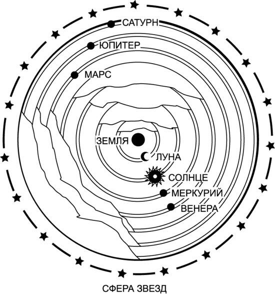 По системе Аристотеля, в центре Мира находится неподвижная Земля. Земной шар окружен сферами из Воды, Воздуха и Огня. Далее вращаются прозрачные («хрустальные») небесные сферы, на которых неподвижно закреплены Луна, Меркурий, Венера, Солнце, Марс, Юпитер и Сатурн. Эти сферы назывались также «небесами» «Небо Луны», «Небо Солнца», «Небо Венеры» и т. д. За «Небом Сатурна» находится последняя сфера «Небо неподвижных звезд». А за ним «Перводвигатель», приводящий всю мировую систему в движение.