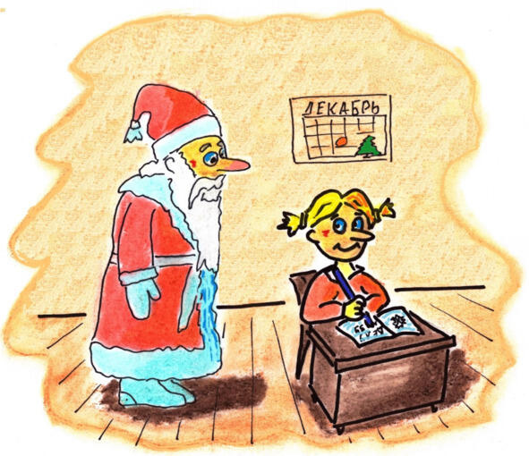 В квартире тепло и уютно. За столом, уставленным игрушками, сидит Катя, перед ней чистый лист бумаги, пишет с мамой письмо Деду Морозу.