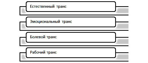 Но следует сказать, что близко к болевому трансу идёт и эмоциональный транс наши воспоминания о том, что мы прошли и пережили. При всей спасительной особенности психики человека со временем вытеснять, забывать тяжёлые переживания, в памяти человека обязательно остаются «точки», прямое или косвенное упоминание о которых радикально меняет самочувствие и настроение человека. Например, воспоминание об операции или о похоронах близкого человека. Впрочем, эмоциональный транс может быть и вполне положительным например, воспоминание и рассказ о счастливом дне своей жизни. Такие случаи мы называем психологическим «ресурсом». Увы, ресурс может быть как положительным, так и отрицательным.