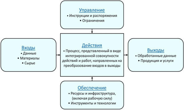 Типовое описание процессов жизненного цикла включает стандартные блоки компонентов (рис. 1.4). Каждый процесс состоит из входа, действия и выхода, дополненных функциями управления и обеспечения.