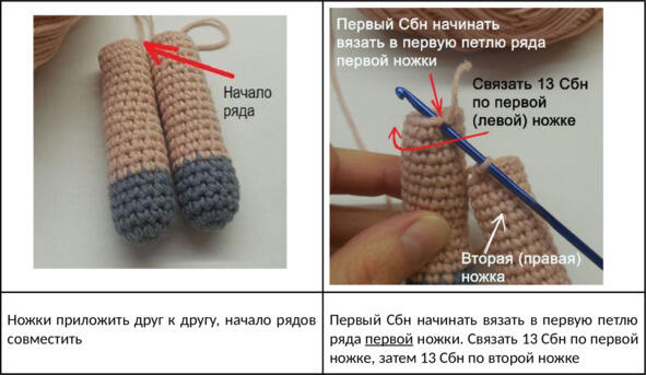 Совет. Чтобы в момент соединения ножек не потерять начало ряда, сделайте «пометочку» (булавочку, контрастная нить) на одной из ножек (например, второй).