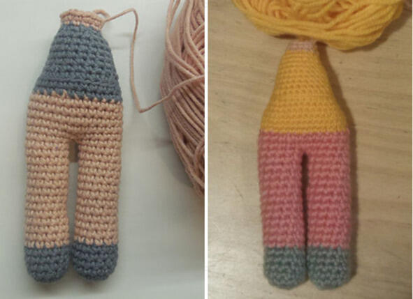 820 ряд. 13 Сбн. Цветную нить (от начала вязания) обрезать, оставив небольшой кончик 23 см. Кончики цветной и телесной нити связать двойным узелком и спрятать внутри ножки.