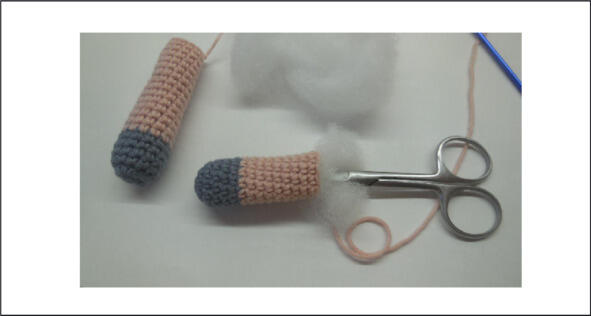 Положить наполнитель. В качестве наполнителя использовать холлофайбер или синтепон. Для набивки удобно использовать простой карандаш либо ножницы, чтобы более плотно забить наполнитель в деталь. Примерно 1 см до края (34 последних ряда) оставить без наполнителя заполним позже.