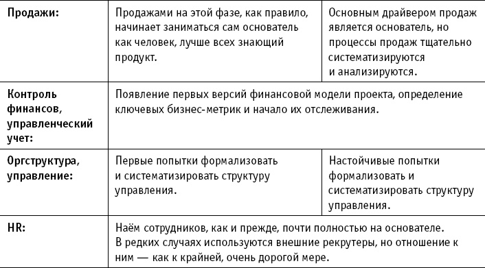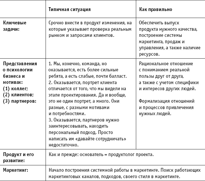 На данном этапе основатель должен обеспечить продуктивное переваривание обратной связи рынка от выпущенного MVP, налаживание бизнес-процессов по созданию и продвижению полноценного продукта, привлечение необходимых ресурсов, а также формирование и поддержание настроя пока немногочисленной команды. На этом этапе начинается еще более явное разделение ролей собственника и одного из участников команды. Если основателей несколько, важно четко разделить операционные роли и ответственность между ними.