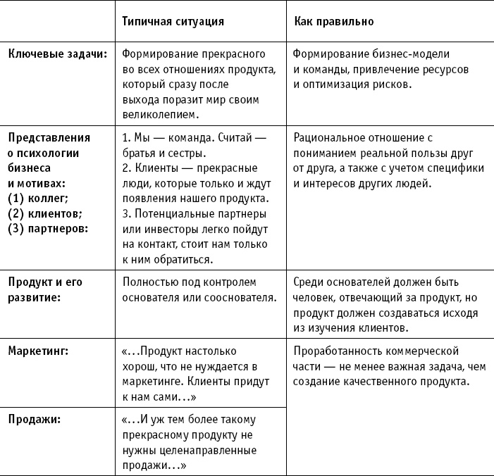 Типичные ошибки: излишняя «влюбленность» в идею, недостаточное внимание и понимание коммерческой части проекта, реальной рыночной ситуации и болей потенциальных клиентов, желание сразу, без подтверждения спроса, создавать полноценный продукт, ориентация на слишком маленький рынок, стремление одним шагом создать огромную компанию, отсутствие какого-либо существенного мотива, кроме денег.