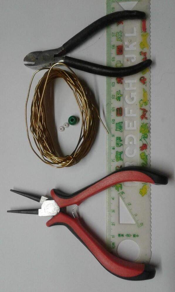 Давайте приступим к работе. Нам надо две маленьких бусинки или две бисеринки, главное, чтобы в них входила проволока. Еще нужна бусинка покрупнее и отрезок проволоки сантиметров 35. Из инструментов нужны кусачки и круглогубцы.