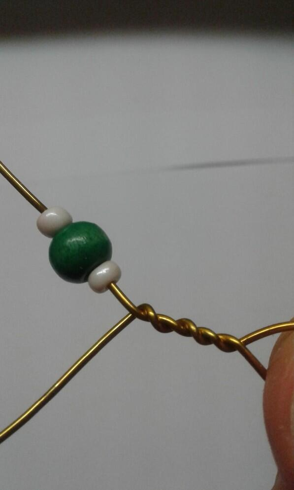 Дальше одеваем три бусинки на один из концов, так чтобы большая бусинка была в окружении маленьких.