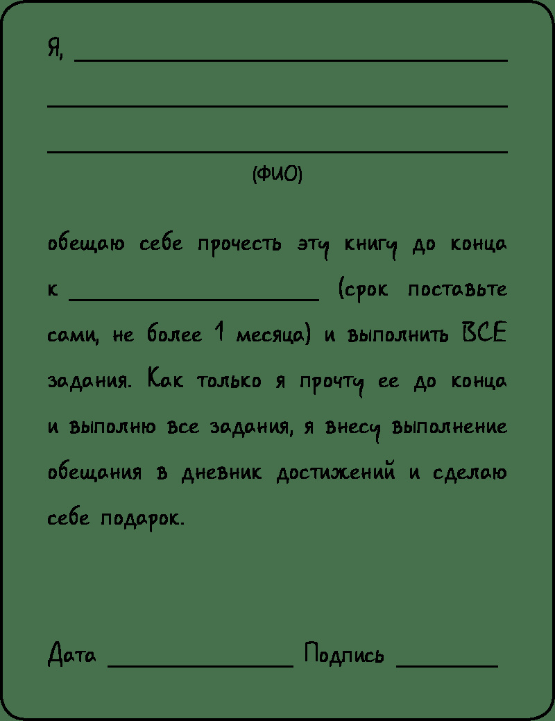Обещание, данное самой себе и выполненное, это кирпичик, который укрепит вашу уверенность в себе и собственных силах. Сейчас вы закладываете фундамент, и каждое следующее задание будет надстройкой над ним.