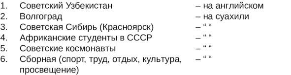 Можно подумать о сериях фотографий на такие темы: жизнь советского Севера (зима); Женщины; Советская армия, флот; Ленинские места; спортивные мероприятия; свадьба с пояснительным текстом, как молодые люди женятся у нас. Здесь жены покупаются за 4001000 шиллингов сумма большая, если учесть, что средняя заработная плата не превышает и 200 ш.