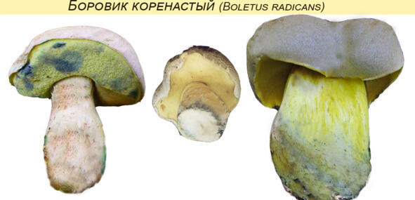 Похожие виды. Боровик коренастый похож также на съедобный полубелый гриб (Boletus impolitus), который имеет шляпку желтоватого цвета и при надавливании и срезе цвет не изменяет.
